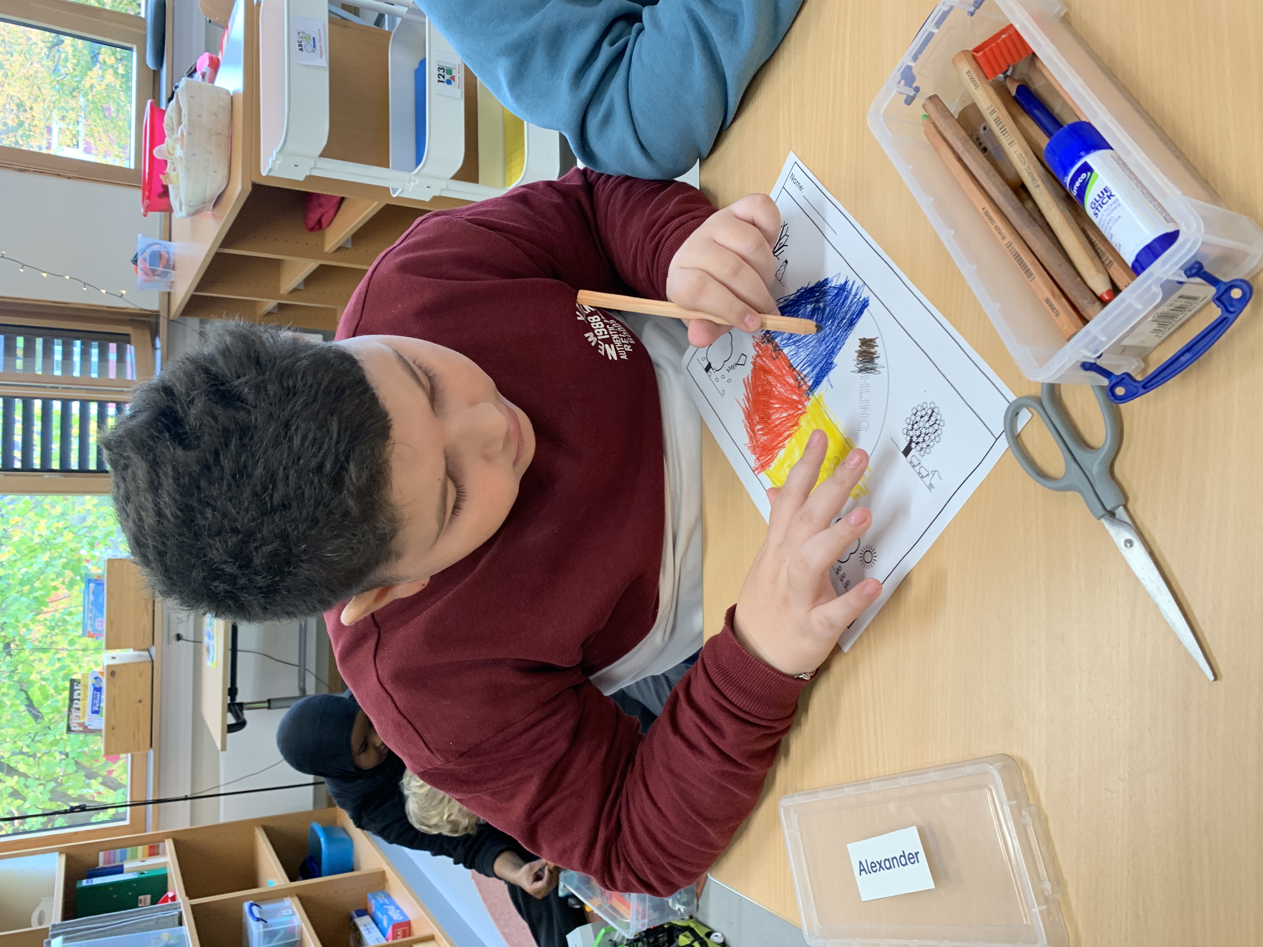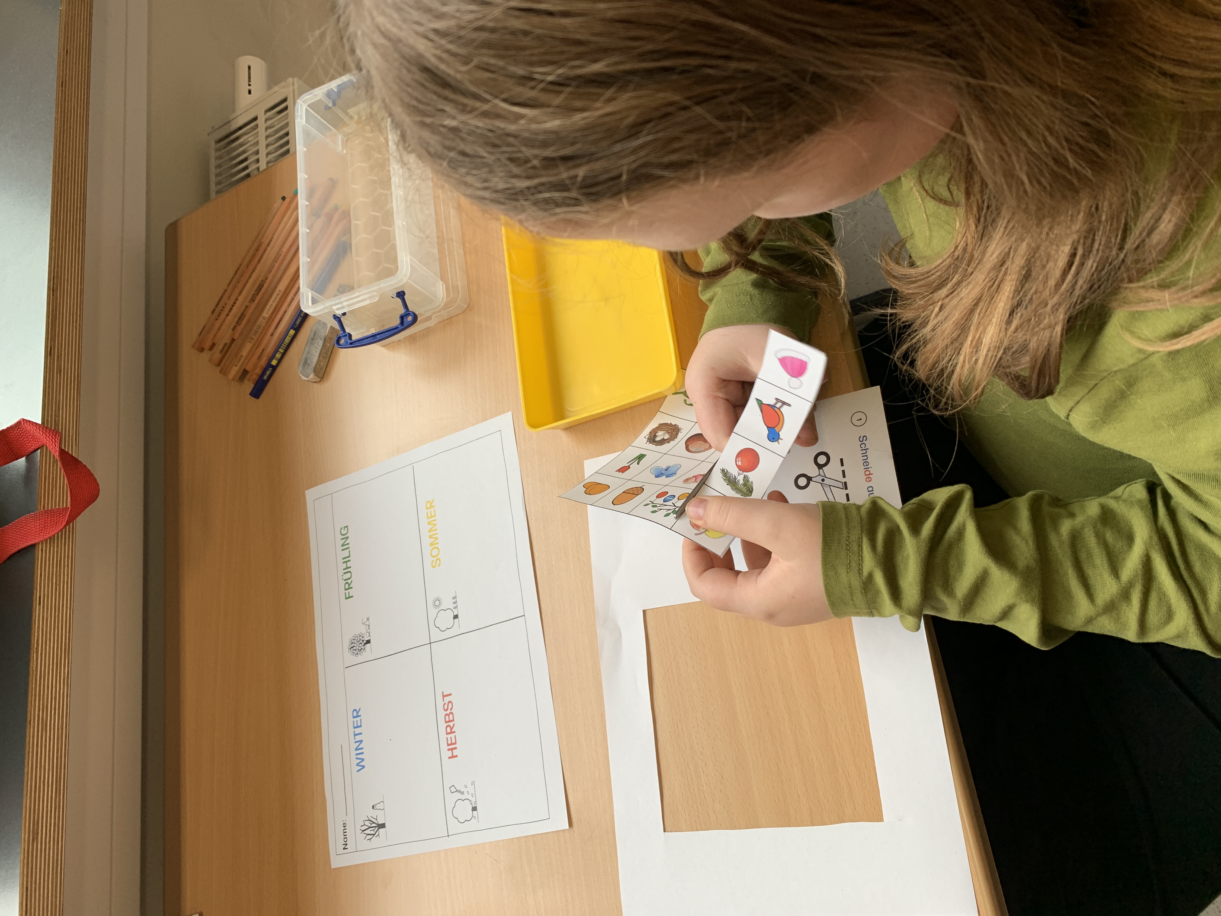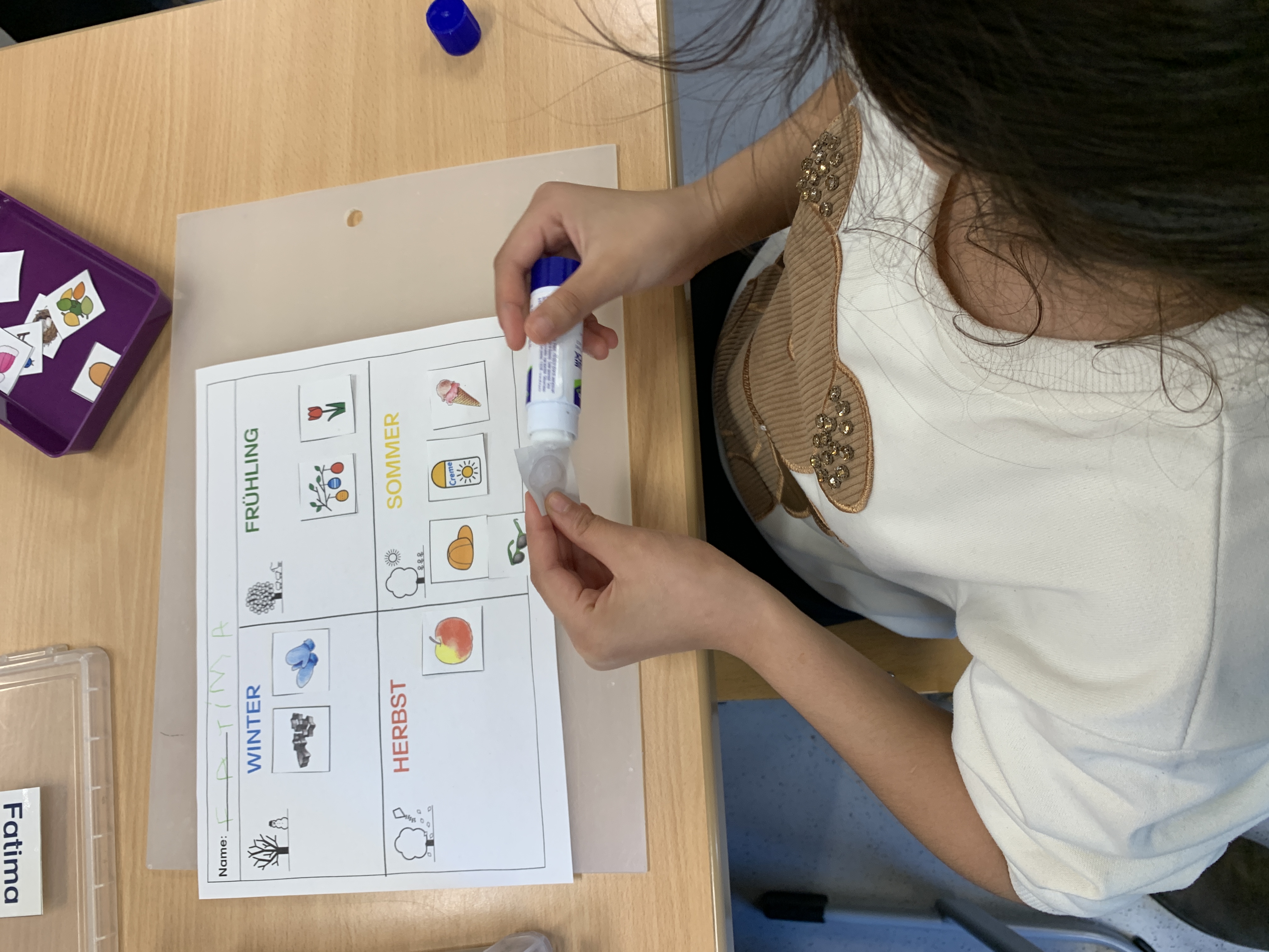 Auf den Fotos sieht man, wie einige Schüler:innen den vier Jahreszeiten passende Piktogramme zuordnen.