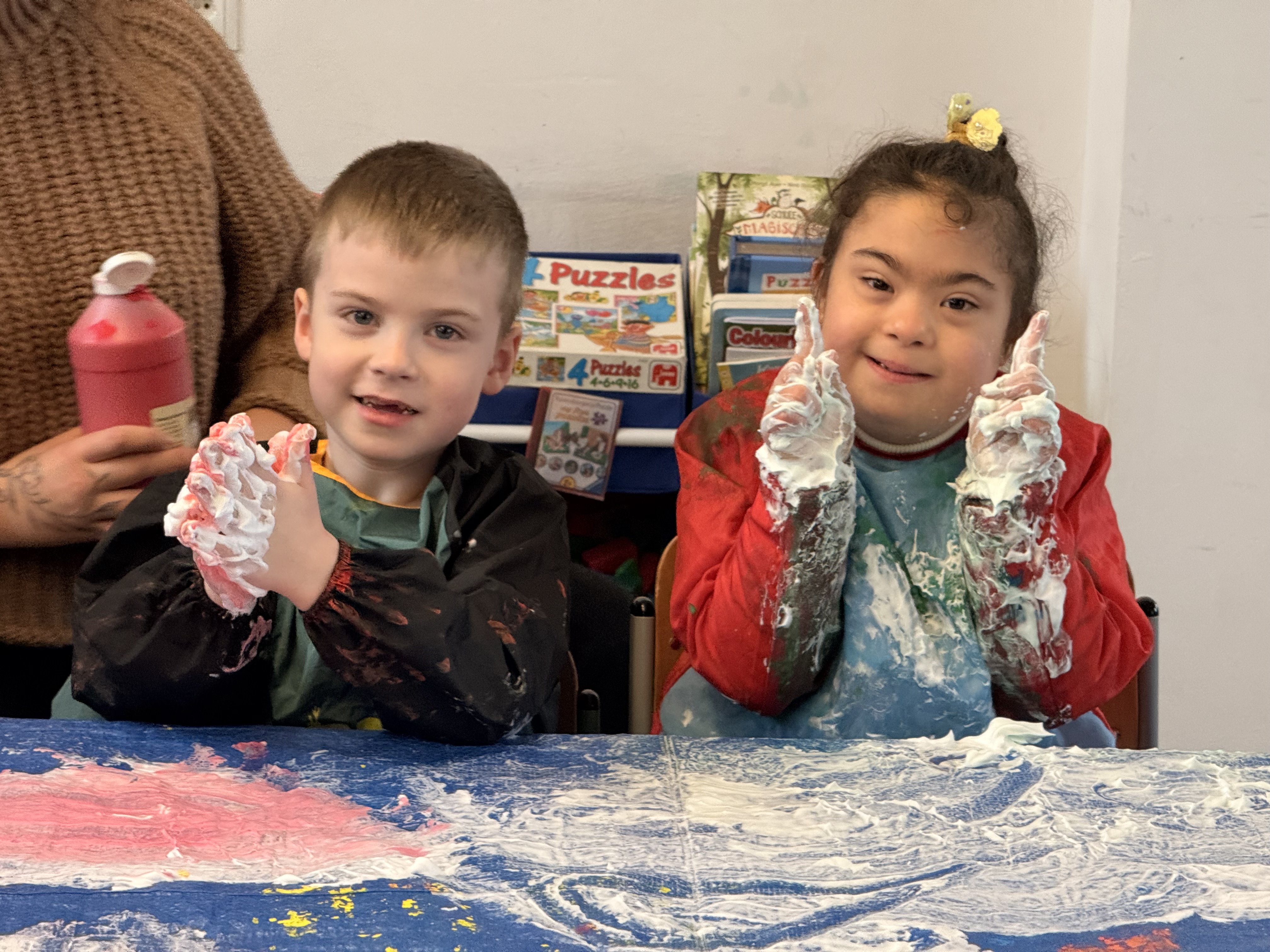 Im Kunstunterricht der Unterstufe haben unsere Schüler:innen die Möglichkeit, viele Materialerfahrungen zu sammeln. Wir matschen mit Rasierschaum und Farbe, stellen Wolkenknete her und entdecken Farben und Konsistenzen mit allen Sinnen. Dabei geht es nicht immer um ein fertiges Bastelprodukt am Ende. Genauso wichtig ist das basale Erfahren: fühlen, mischen, drücken, staunen. So fördern wir Wahrnehmung, Motorik, Selbstwirksamkeit und kreative Ausdrucksmöglichkeiten.