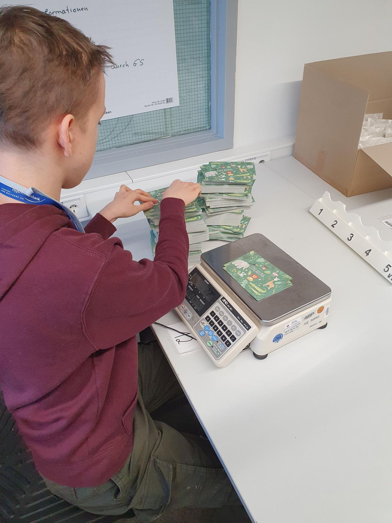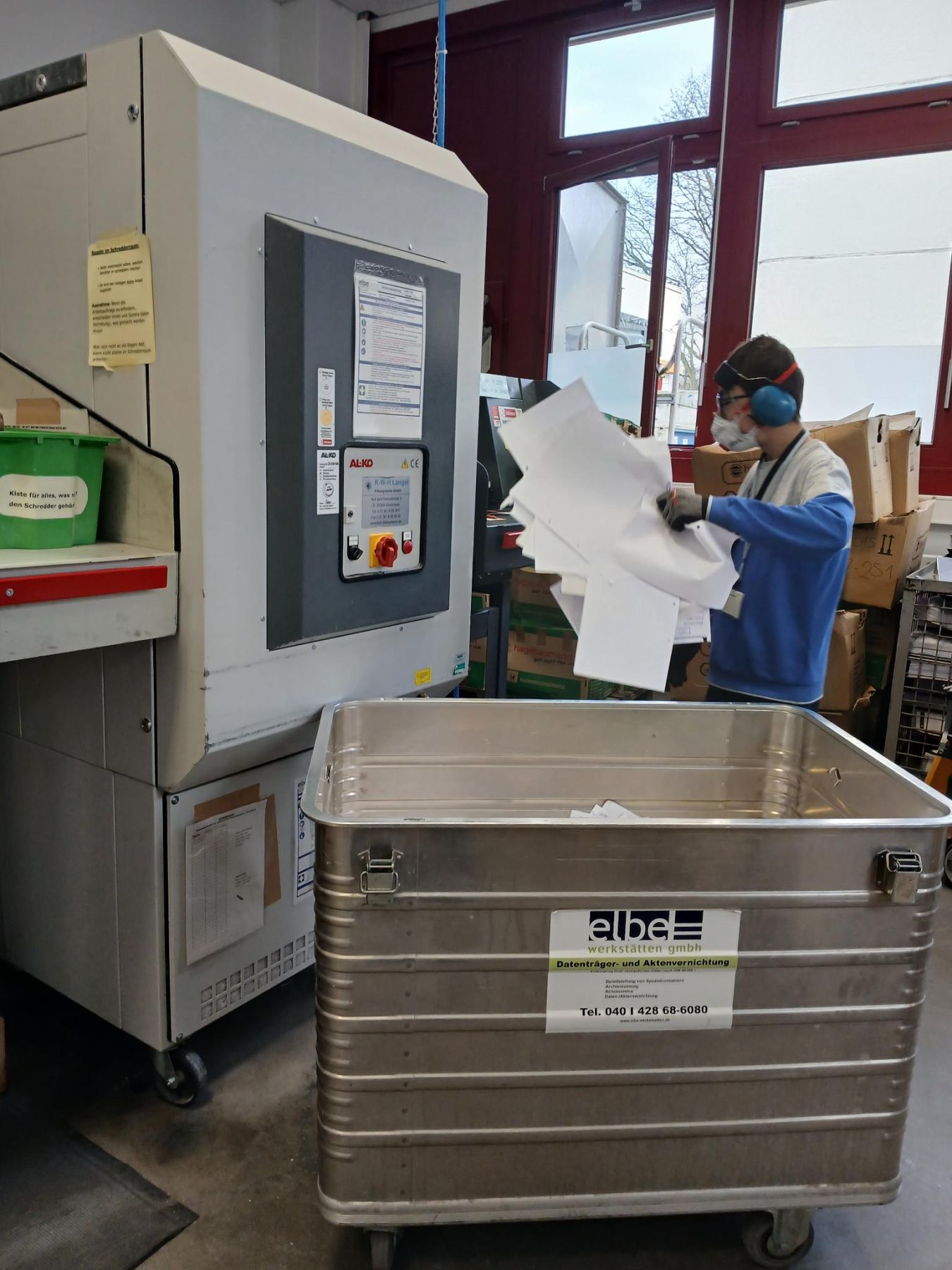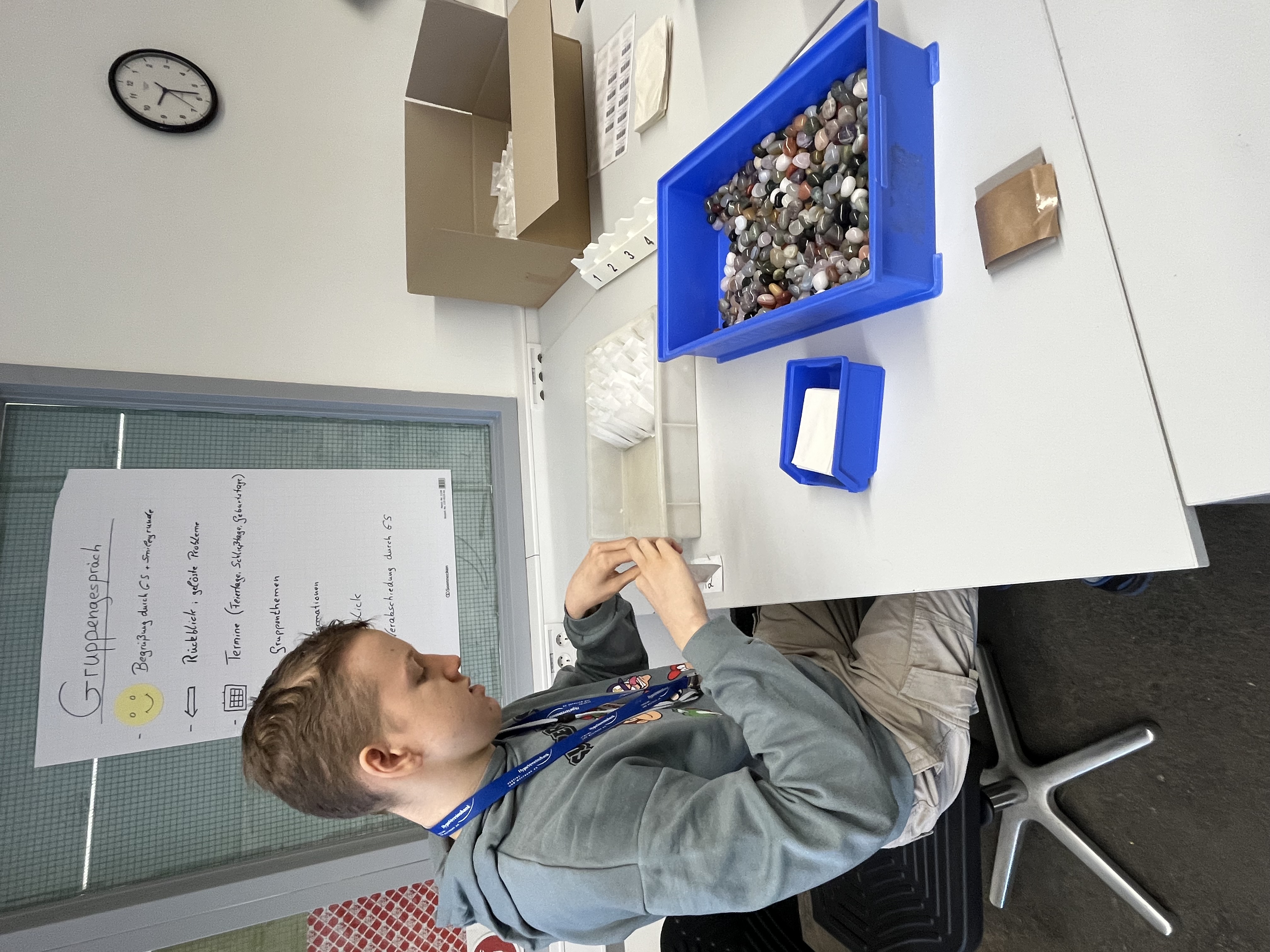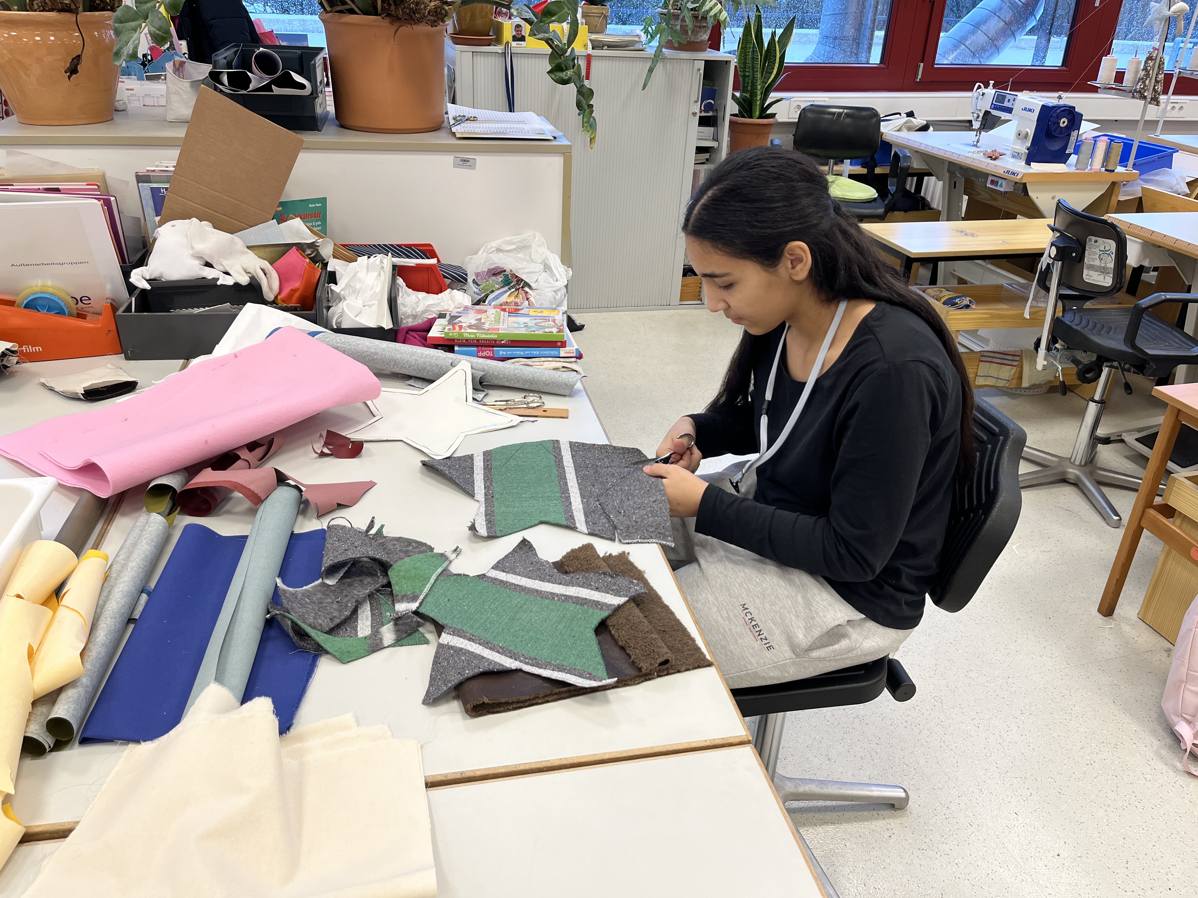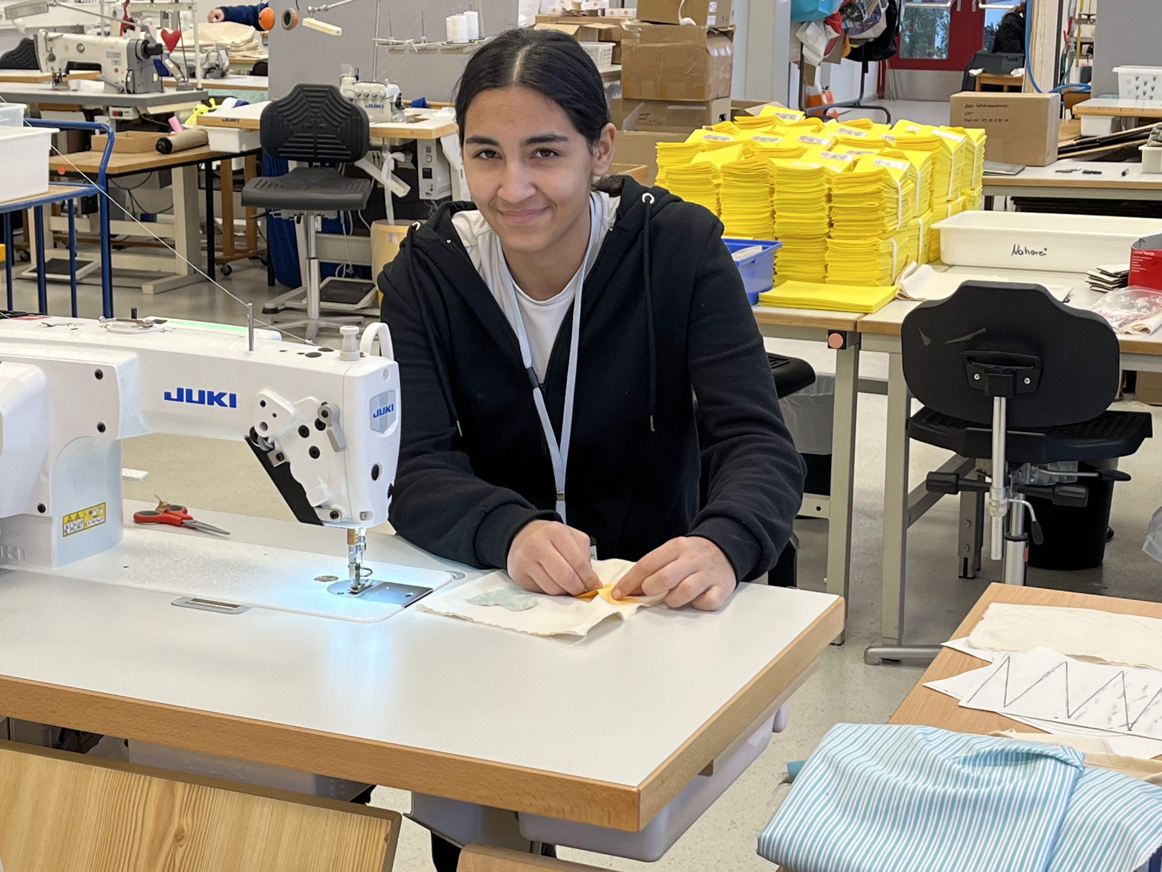 Wir haben uns in verschiedenen Räumlichkeiten angeguckt, wie Menschen mit Behinderungen arbeiten. Wir waren zum Beispiel in der Küche, in der Elektro-Abteilung, vor der Aktenvernichtung, im Büroservice, in der Näherei und in Verpackungsgruppen.
