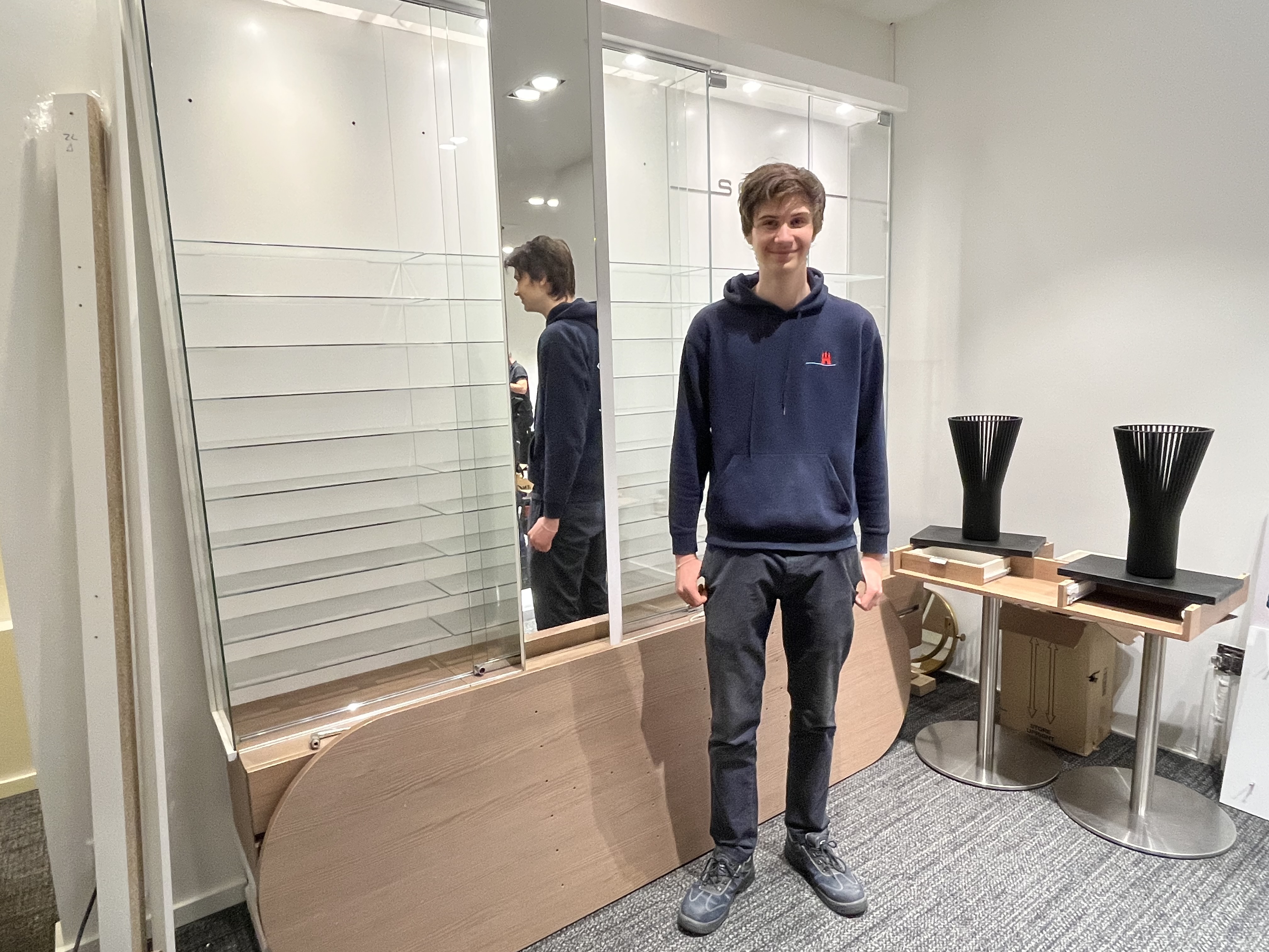In der zweiten Woche hatten wir noch einen Auftrag, in der Hamburger Meile. Und zwar mussten wir einen Optikerladen einrichten. Dazu haben wir ein paar Materialien abgeholt um damit Schränke aus Holz und Glas bauen zu können.